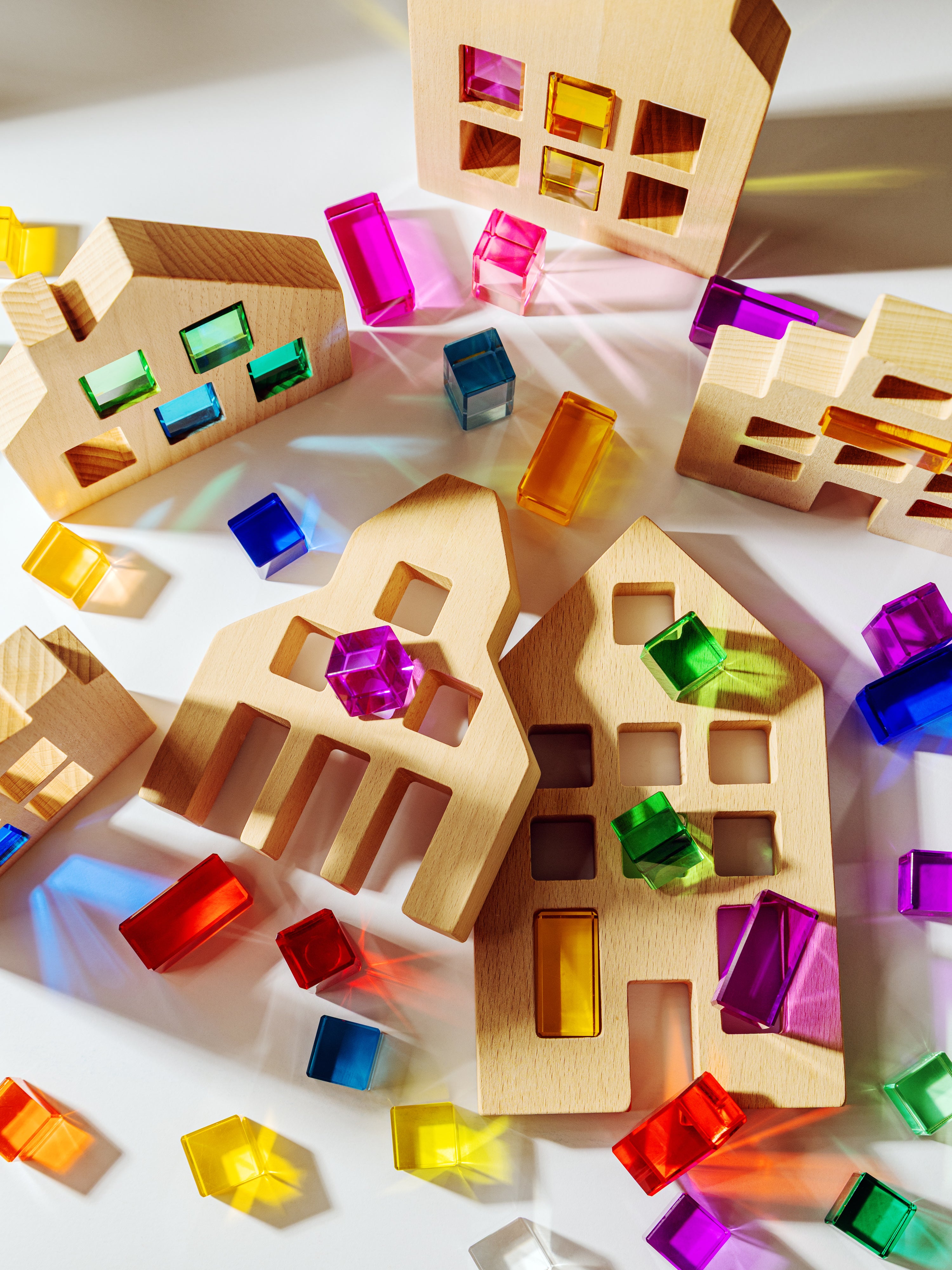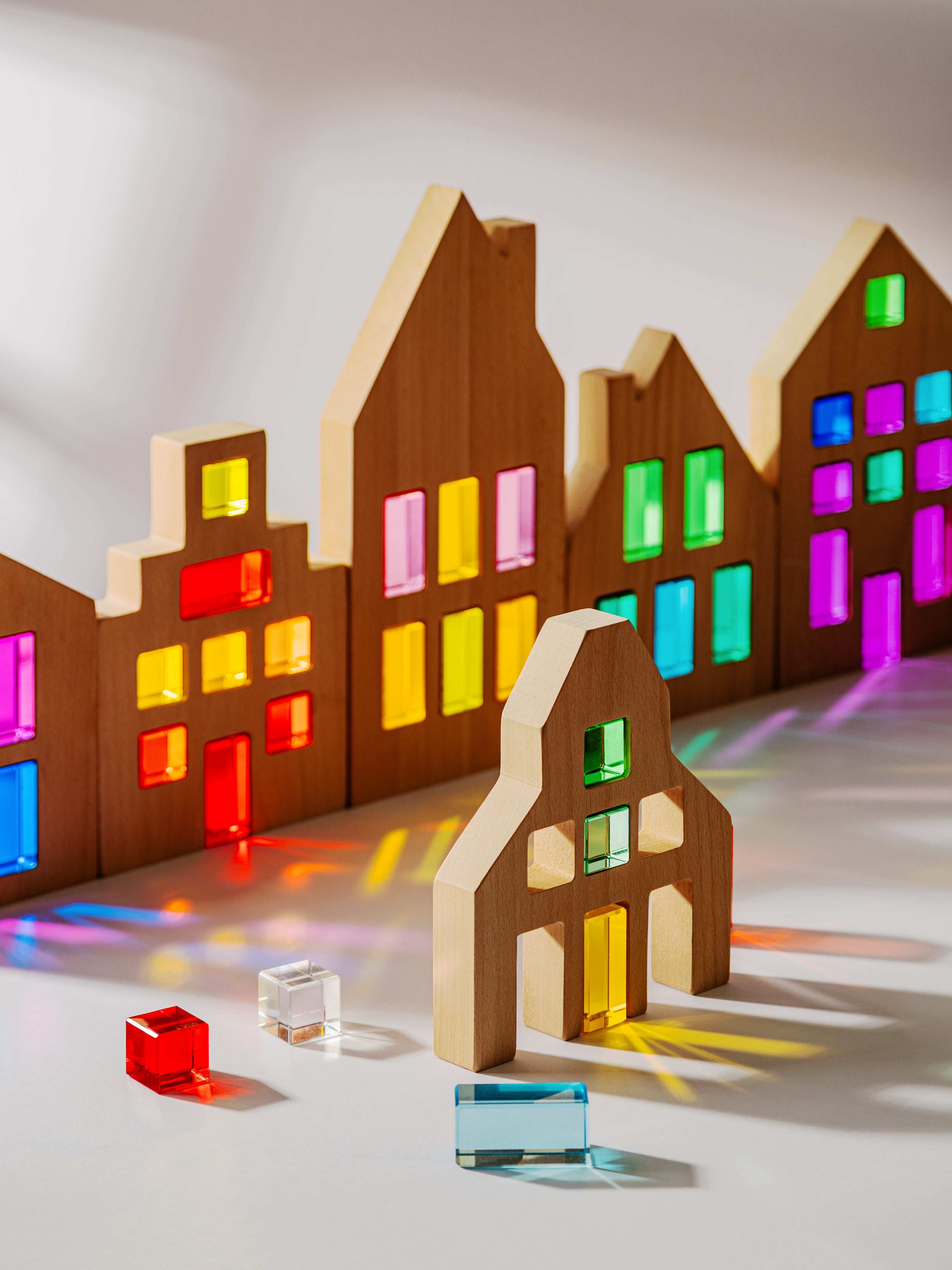 • Wooden houses with colorful transparent windows on a neutral background