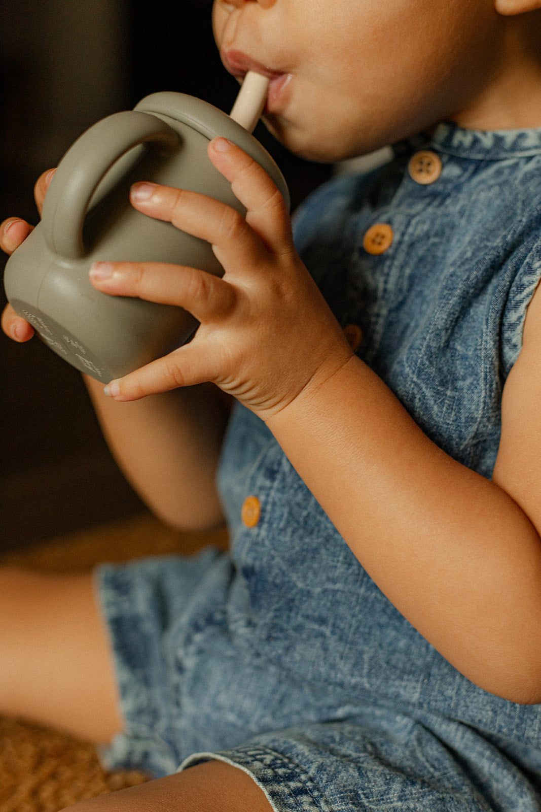 Introducing the new and improved Leo Sippy Cup! Perfect for infants and toddlers, this cup features double handles for easy self feeding, a spout and ergonomic bent straw, and a leak proof design. Plus, with its added stopper, the straw can't be pulled out and thrown mid-use. Keep track of your child's intake with the convenient interior measurement markings. And for even more versatility, simply remove the lid to use as an open training cup with or without a straw. Made of 100% food-grade silicone, this cup is free of harmful chemicals and fillers.