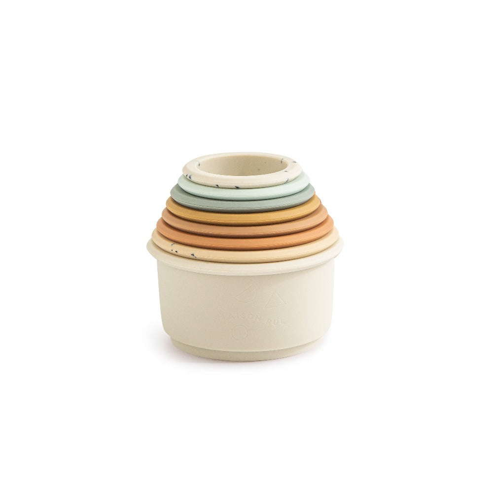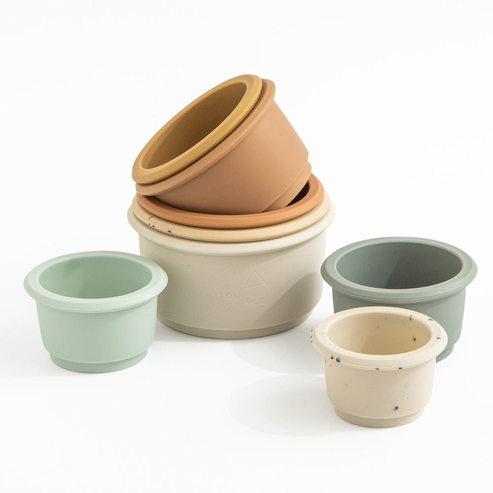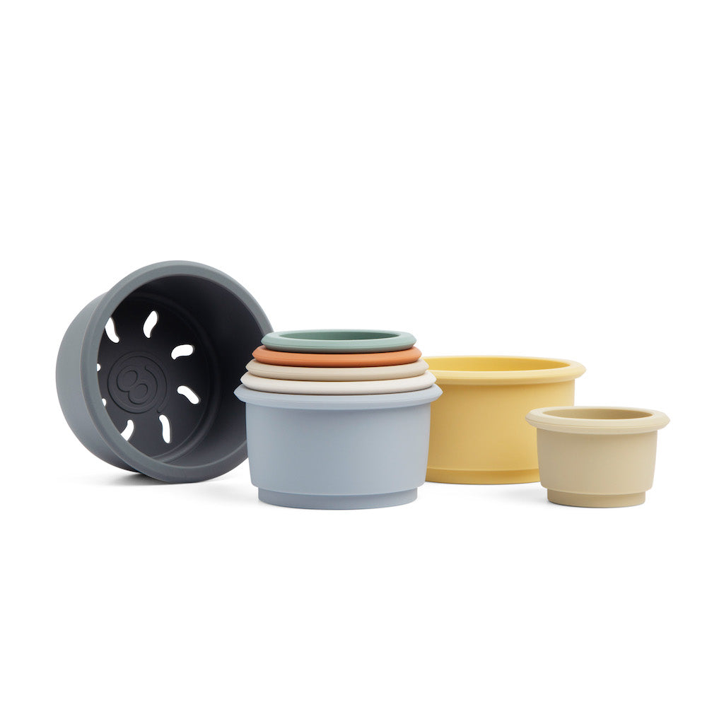 8 vibrant silicone stacking cups that are 100% food-grade. Encourages growth of fine motor abilities, thinking, imagination, and communication skills. Each cup has a number and a design inspired by the weather, for counting, categorizing, and identifying colors. Use them to make shapes on the wall at bedtime or for pouring during bath time. Unlike plastic options, Silicone is gentle on gums and can be safely chewed. It's strong enough for tossing and throwing and will endure for years without cracking! Choose from Confetti, Honey, Slate, or Rose color schemes.